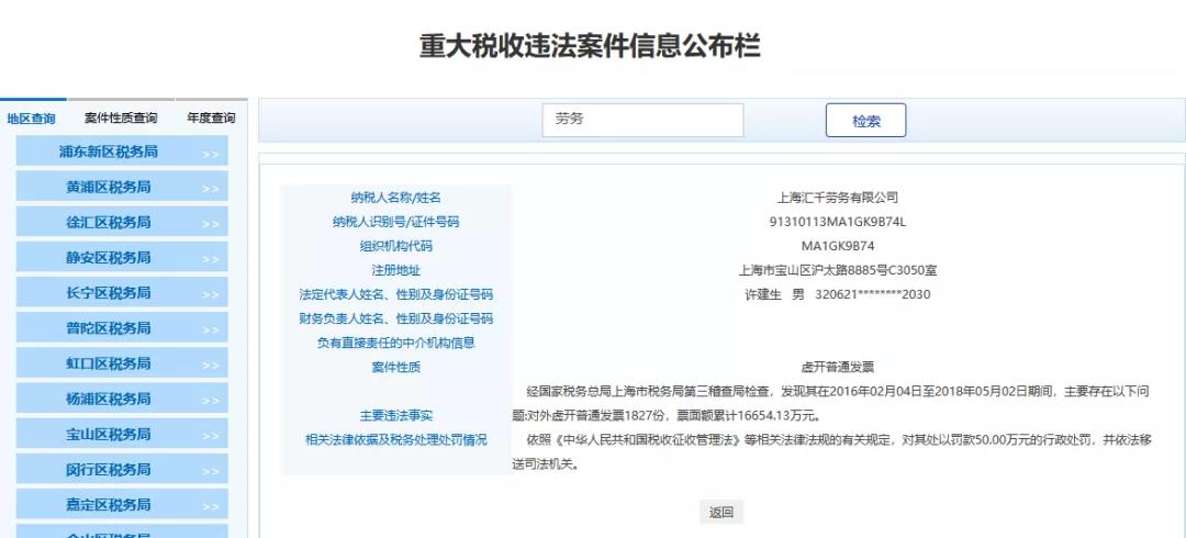 最近魔都上海傳來大消息,多家勞務(wù)公司和人力公司被查,清一色的罰款+移送司法機(jī)關(guān),不難看出勞務(wù)公司一直是稽查重點,也是虛開的重災(zāi)區(qū),一查一個準(zhǔn)!