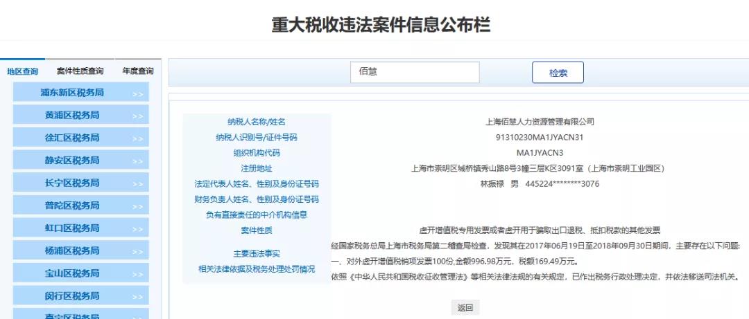 5、上海XX人力資源管理有限公司,經(jīng)國家稅務(wù)總局上海市稅務(wù)局第二稽查局檢查,發(fā)現(xiàn)其在2017年06月19日至2018年09月30日期間,主要存在以下問題:對外虛開增值稅銷項發(fā)票100份,金額996.98萬元,稅額169.49萬元。依照《中華人民共和國稅收征收管理法》等相關(guān)法律法規(guī)的有關(guān)規(guī)定,已作出稅務(wù)行政處理決定,并依法移送司法機(jī)關(guān)。