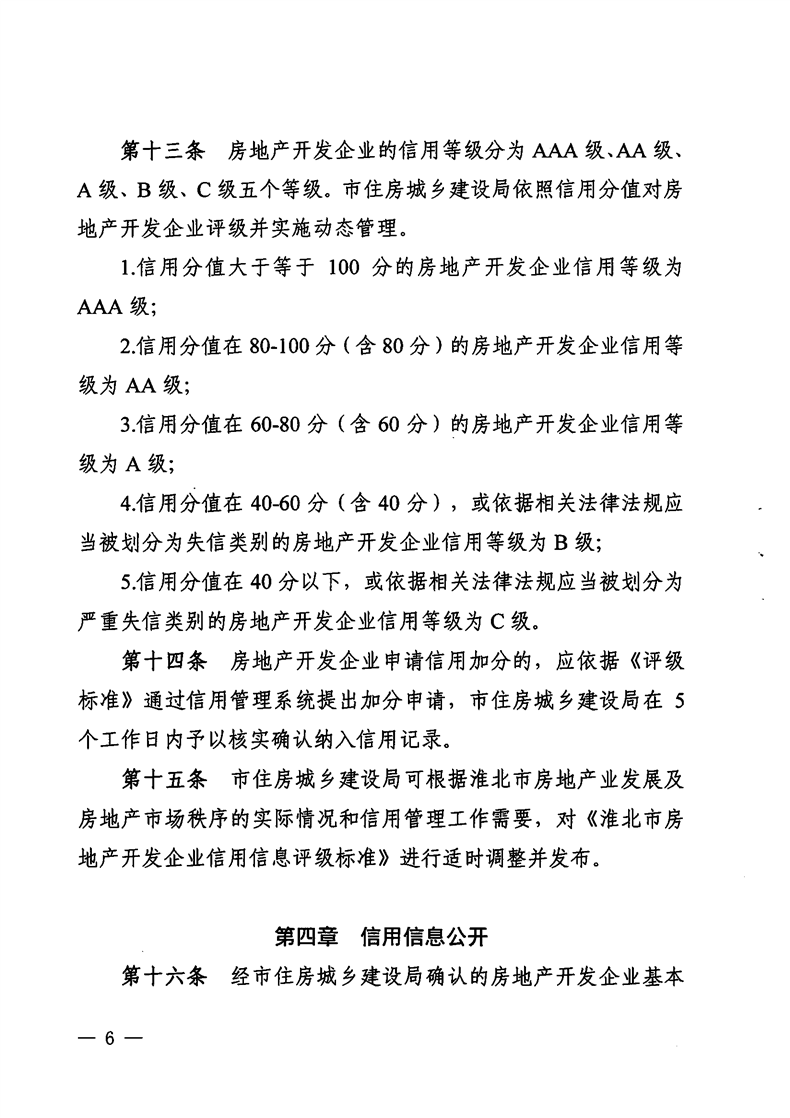 重磅消息!淮北市住房和城鄉(xiāng)建設(shè)局官網(wǎng)昨日發(fā)布關(guān)于印發(fā)《淮北市房地產(chǎn)開發(fā)企業(yè)信用管理辦法》的通知(淮住建規(guī)【2022】1號(hào))文件,擬對(duì)開發(fā)商信用進(jìn)行評(píng)級(jí),并根據(jù)開發(fā)企業(yè)信用不同等級(jí)實(shí)施差異化管理,為規(guī)范房地產(chǎn)開發(fā)經(jīng)營行為,促進(jìn)房地產(chǎn)業(yè)持續(xù)健康穩(wěn)定發(fā)展提供政策指引。具體內(nèi)容如下: